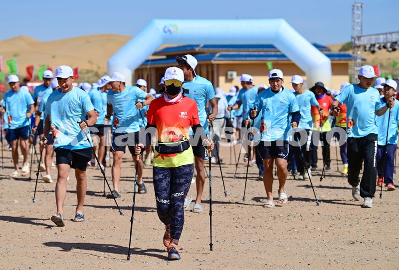 Caption:Sports enthusiasts participate in a 10-kilometer Nordic walking competition in the Jinshaling Desert in Ordos, Inner Mongolia autonomous region, on June 25, 2024. Nearly 1,000 contestants competed in the scenic outdoor sports event.