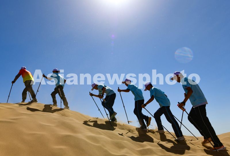 Caption:Sports enthusiasts participate in a 10-kilometer Nordic walking competition in the Jinshaling Desert in Ordos, Inner Mongolia autonomous region, on June 25, 2024. Nearly 1,000 contestants competed in the scenic outdoor sports event.