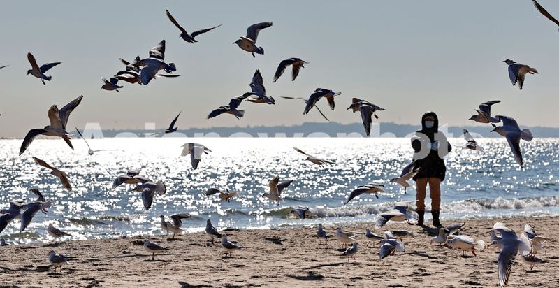 Seagulls are seen foraging on a beach in Haigang district of Qinhuangdao, Hebei province, December 23, 2024. Recently, a large influx of migratory seagulls has landed on the beach, where they can be observed foraging and playing by the sea, drawing numerous tourists who come to engage with them.