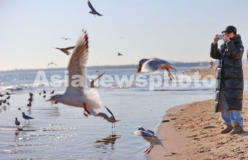 Seagulls are seen foraging on a beach in Haigang district of Qinhuangdao, Hebei province, December 23, 2024. Recently, a large influx of migratory seagulls has landed on the beach, where they can be observed foraging and playing by the sea, drawing numerous tourists who come to engage with them.