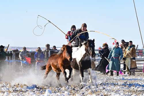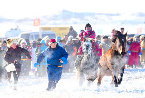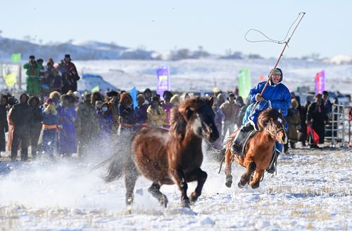Herdsmen comepete during a horse race on snow in Xilingol, Inner Mongolia autonomous region, December 28, 2024.