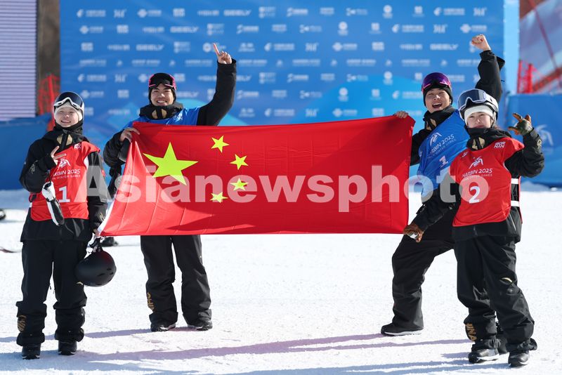 China's Zhang Xiaonan, Yang Wenlong, Jiang Xinjie, and Xiong Shirui (from left to right) celebrate after the women's and men's snowboard big air final match at the 9th Asian Winter Games in Yabuli, Northeast China's Heilongjiang province, Feb 10, 2025.