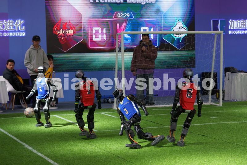 Caption:Humanoid robotic soccer players from Beijing-based high-tech company Booster Robotics compete for a ball — a unique show as part of the Global Developer Conference — in Shanghai on on February 21, 2025.