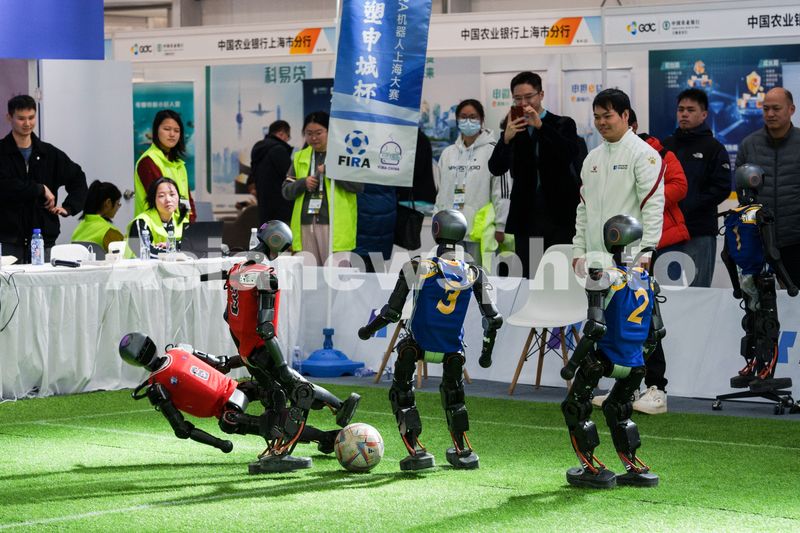Caption:Humanoid robotic soccer players from Beijing-based high-tech company Booster Robotics compete for a ball — a unique show as part of the Global Developer Conference — in Shanghai on on February 21, 2025.