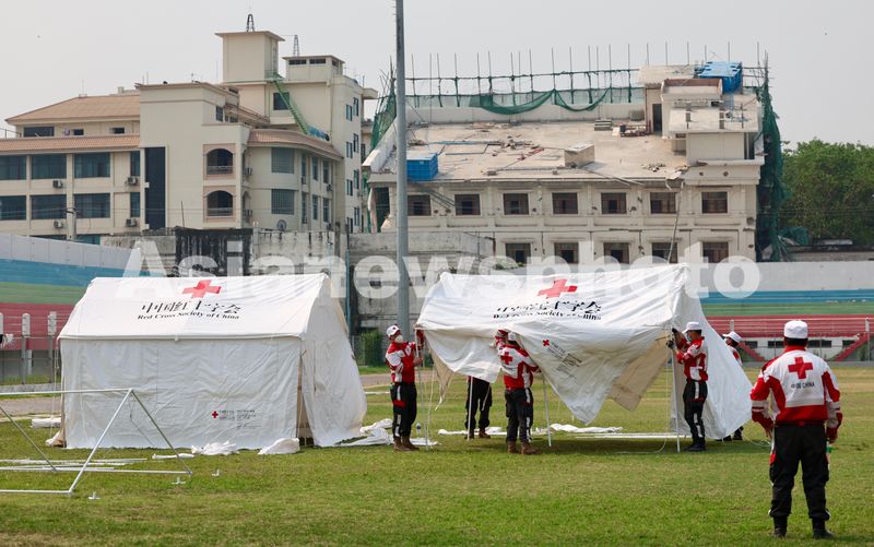 Caption:Members of the Chinese Red Cross International Emergency Response Team build makeshift homes for earthquake-affected residents in Mandalay, Myanmar, on April 4, 2025. The first batch of aid supplies from the Red Cross Society of China was transferred to the Myanmar Red Cross on Thursday after a devastating 7.9-magnitude earthquake struck Myanmar. The supplies include tents, blankets, folding beds, and family kits to support the affected households.
