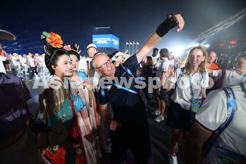 8月7日,开幕式后,一名外国代表团成员与开幕式演员自拍留影。