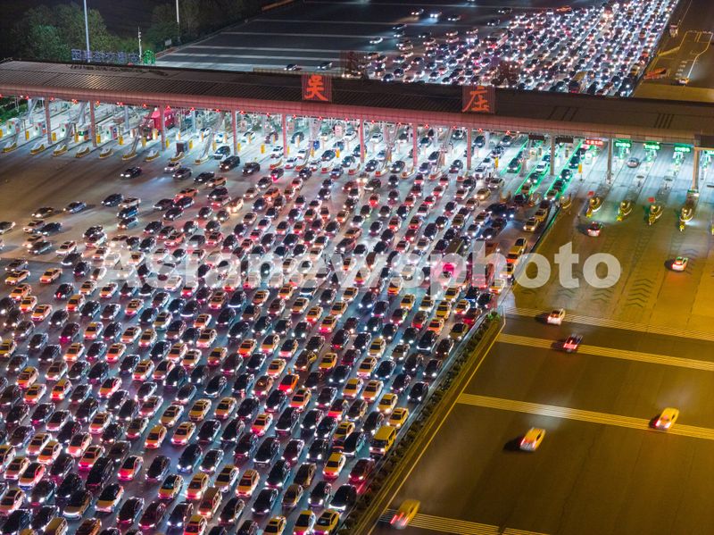 Caption:A drone photo taken on Oct. 7, 2025 shows vehicles passing through Wuzhuang toll station on the G40 Shanghai-Shaanxi Expressway, located in Quanjiao County, Chuzhou City, Anhui Province. As the National Day and Mid-Autumn Festival holiday is drawing to a close, return travel flows increase across the country.