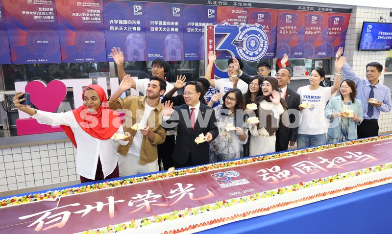 Caption:Tianjin University President Chai Liyuan (front, third from left) joins faculty members, students and alumni on October 2, 2025 in sharing the 130th anniversary cake at the university in Tianjin.