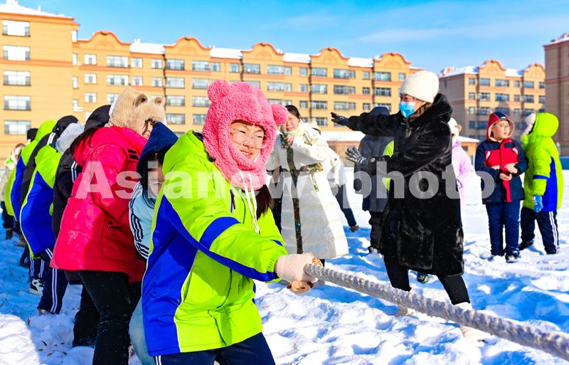 Students play tug-of-war on snow during the break between classes at a primary school in Hulun Buir, Inner Mongolia autonomous region, December 9, 2025.