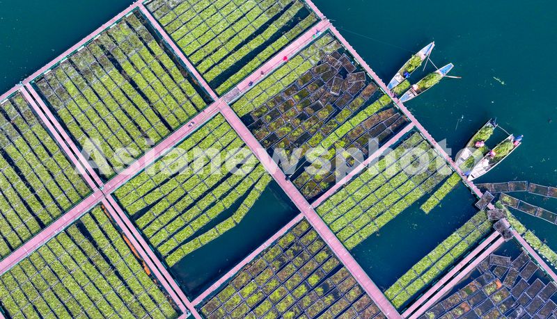 Workers plant winter-hardy aquatic vegetables on an ecological floating island in Qiandao Lake, Chun'an county, Zhejiang province, on December 10, 2025. The floating islands, equipped with waterpurifying plants, have been deployed in key areas to help protect and improve the lake water quality.