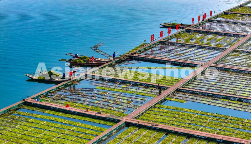 Workers plant winter-hardy aquatic vegetables on an ecological floating island in Qiandao Lake, Chun'an county, Zhejiang province, on December 10, 2025. The floating islands, equipped with waterpurifying plants, have been deployed in key areas to help protect and improve the lake water quality.