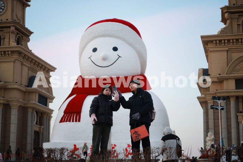 Tourists take photos in front of a giant snowman at the Qunli music park in Harbin, northeast China's Heilongjiang Province, December 16, 2025. This year's giant snowman, 19 meters in height and made with some 3,000 cubic meters of snow, is one meter taller than that of last year.