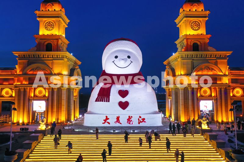 Tourists take photos in front of a giant snowman at the Qunli music park in Harbin, northeast China's Heilongjiang Province, December 16, 2025. This year's giant snowman, 19 meters in height and made with some 3,000 cubic meters of snow, is one meter taller than that of last year.