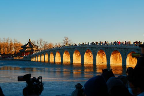 People visit the 17-Arch Bridge, with the sunset's glow shining through its arches, at the Summer Palace in Beijing on December 20, 2025. The annual optical marvel occurs around Winter Solstice, the shortest day of the year, which fell on Sunday this year. Winter Solstice denotes the beginning of deep winter and a break from farming in traditional agricultural society in Chinese culture.