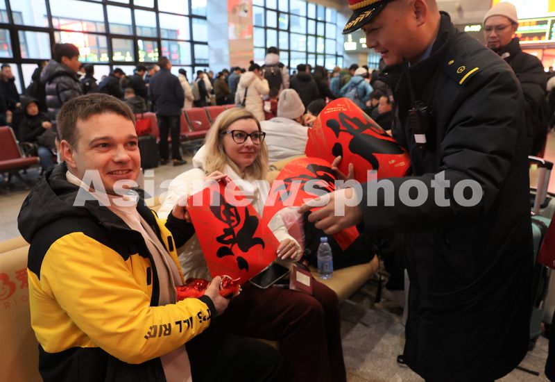 Caption:Staff give Spring Festival decorations to passengers at the Beijing West Railway Station in Beijing, February 2, 2026. China's annual Spring Festival travel rush began on Monday, with inter-regional trips expected to hit a record 9.5 billion.