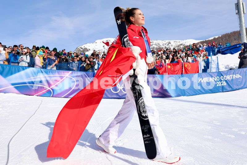 Caption:Gold medalist Gu Ailing of China shows her medals after the awarding ceremony for freestyle skiing women's freeski halfpipe at the Milan-Cortina 2026 Olympic Winter Games in Livigno, Italy, February 22, 2026.