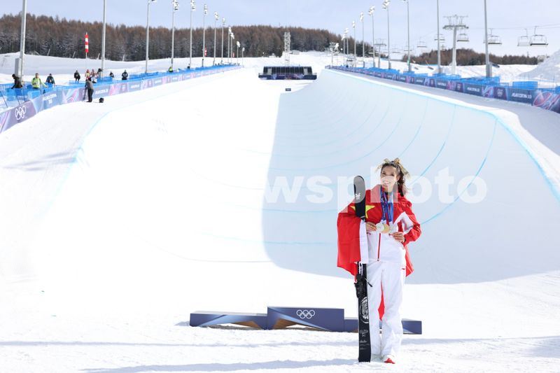 Caption:Gold medalist Gu Ailing of China shows her medals after the awarding ceremony for freestyle skiing women's freeski halfpipe at the Milan-Cortina 2026 Olympic Winter Games in Livigno, Italy, February 22, 2026.