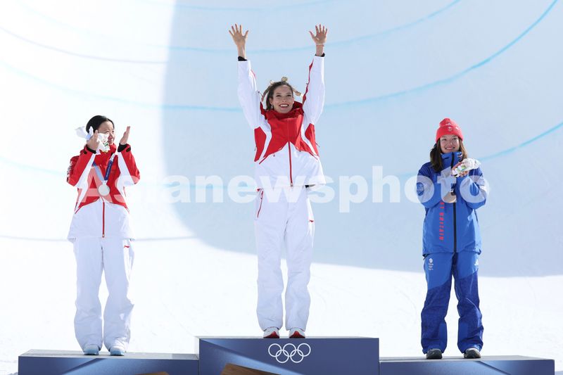 Caption:Gu Ailing (center) of China, Li Fanghui (left) of China and Great Britain's Zoe Atkin pose during the awarding ceremony for freestyle skiing women's freeski halfpipe at the Milan-Cortina 2026 Olympic Winter Games in Livigno, Italy, February 22, 2026.
