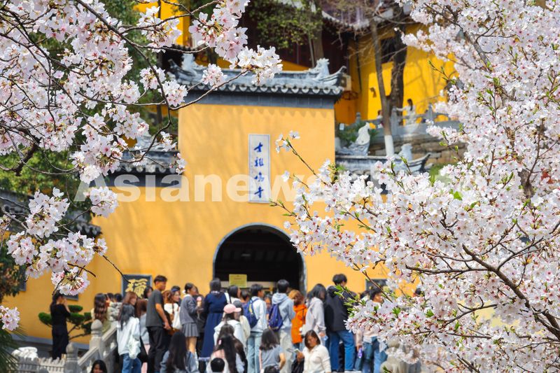 Caption:Tourists gather to view the cherry blossoms along Jiming Temple Road in Nanjing, the capital of Jiangsu province, which have entered their peak flowering period, March 28, 2026.