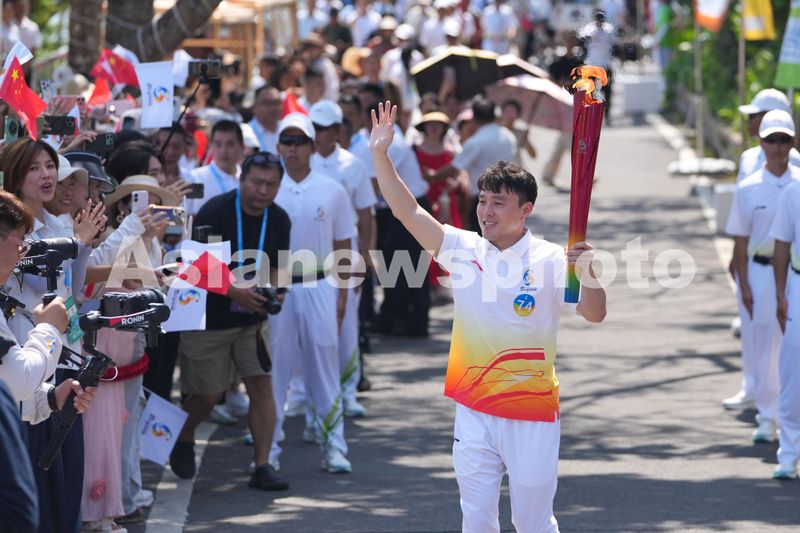 Chinese freestyle aerials skier Qi Guangpu runs holding the torch during the torch relay for the 6th Asian Beach Games Sanya 2026 in Sanya, south China's Hainan Province, March 30, 2026.