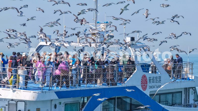 Caption:Tourists enjoy close encounters with black-tailed gulls during a boat ride off Rongcheng, Shandong province, on March 28, 2026. The convergence of student spring breaks in multiple Chinese cities with the upcoming Qingming Festival, or Tomb Sweeping Day, has created an extended travel period from Wednesday to April 6, forming a key new growth opportunity for the tourism market, according to travel agencies.
