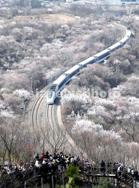 The S2 Line of the Beijing Suburban Railway glides through a sea of blossoms at the foot of the Juyongguan Great Wall, creating a breathtaking scene that attracted throngs of visitors, March 29, 2026. From late March to mid-April, the S2 Line's route reaches the peak of its floral season, with mountains awash in vibrant blooms. The train passing through the delicate pink and white flowers against the backdrop of the majestic Great Wall resembles a scene from a storybook, making it a "star" springtime destination for travelers in the Beijing-Tianjin-Hebei region.