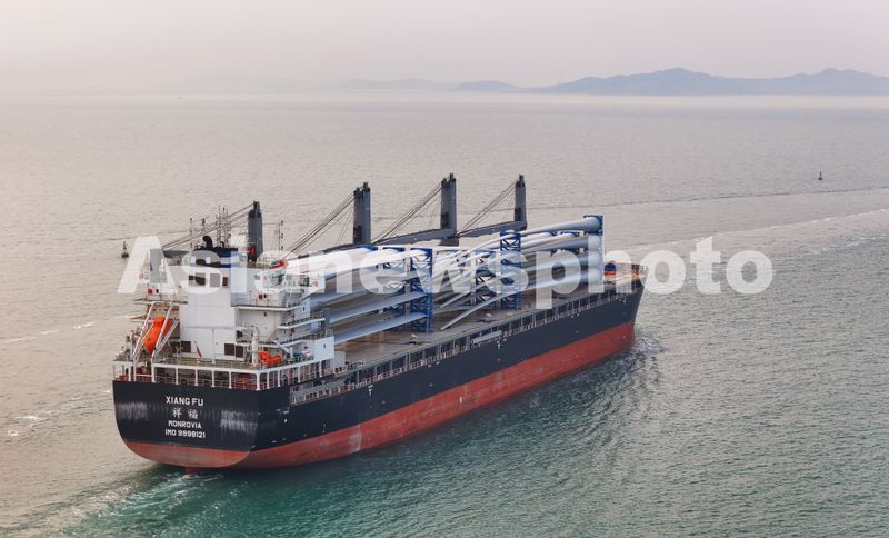 A drone photo shows a cargo ship loaded with wind power equipment for export to Austria setting sail from the Penglai Port Area of Yantai Port in east China's Shandong Province, March 28, 2026. Seven sets of domestically produced wind power equipment were loaded and dispatched to Austria from the Penglai Port Area on Saturday.