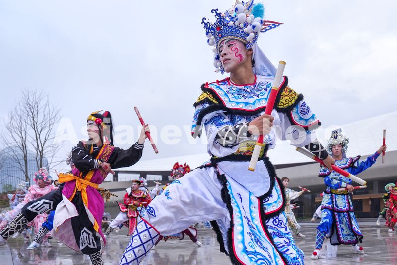 Young Yingge dance artists from the Chaoshan region of Guangdong Province performed the traditional Chaoshan Yingge Dance in Anji, Huzhou, Zhejiang Province, March 30, 2026, attracting citizens and tourists to come and watch.