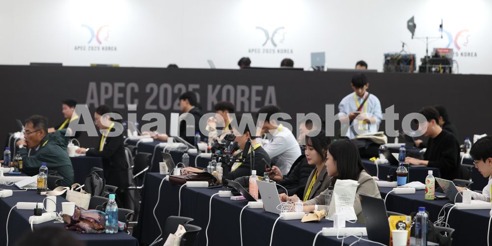 当地时间2025年10月28日,韩国庆州,媒体记者在APEC国际媒体中心内工作。亚太经合组织(APEC)第三十二次领导人非正式会议将于10月31日至11月1日在韩国庆州举行。